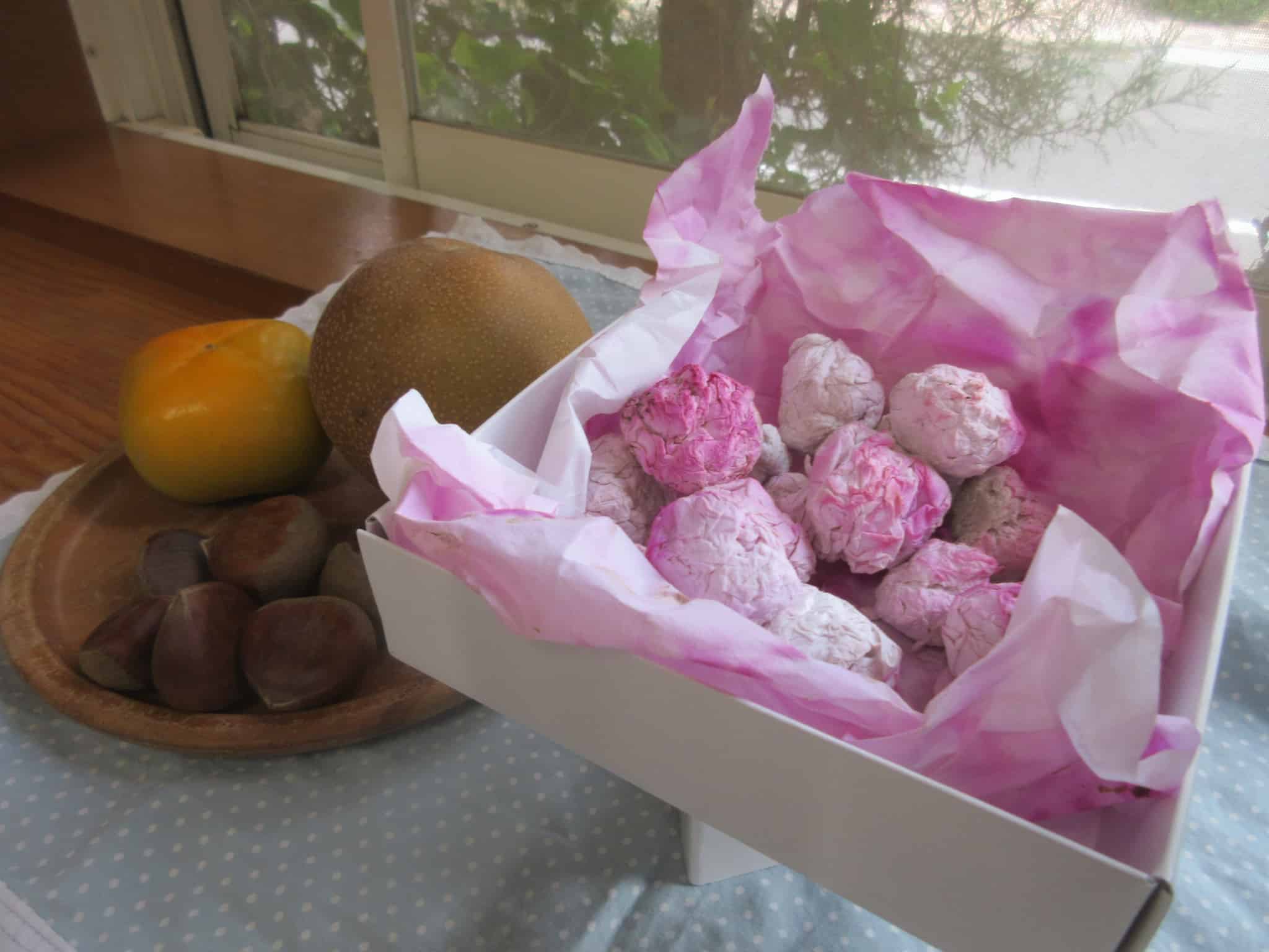 子どもたちが、ヤマゴボウで染めた和紙を丸めて、お団子を作ってくれました。
