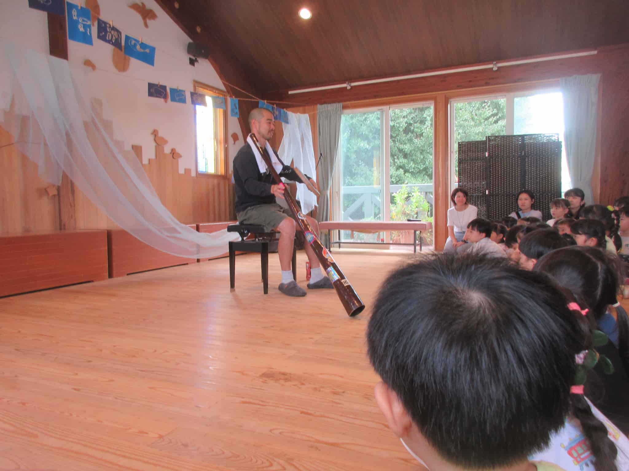 パンマンさんからは、「ディジュリドゥ」というオーストラリアの民族楽器について教えてもらい、低く大きい楽器の音に圧倒されている様子も。「ふねの音みたい!」という声も聞こえてきました。