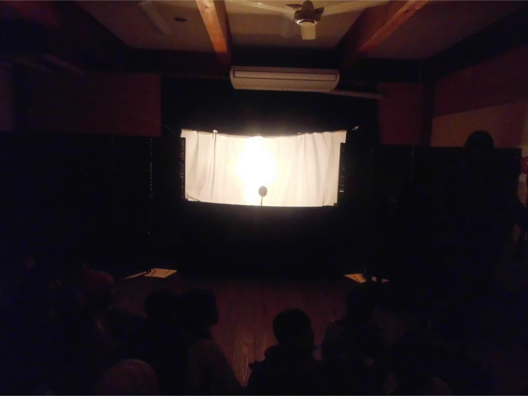お部屋が暗くなって、影絵クイズがはじまりました。卵の中から、いろいろなものが生まれます。