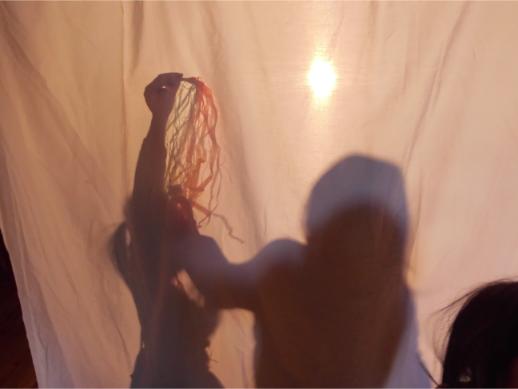 全身の影をうつして楽しんだり、手の影をうつして、前から自分の影を確認してみたり、劇ごっこも始まりました。