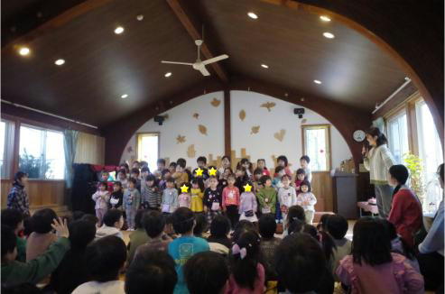 全員が舞台に立って、日頃から楽しんでいる歌や、手あそびを