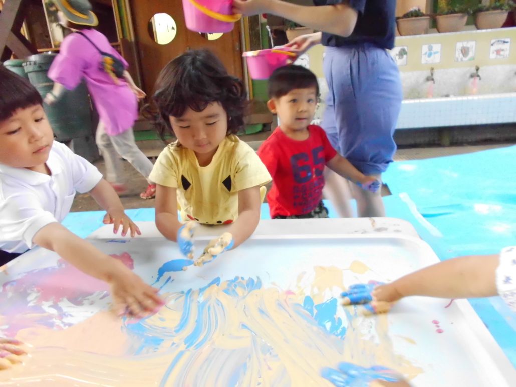 絵の具が変化していく様子を見て触って感じながら、思いを言葉にして周りの子や先生と気持ちを共有する楽しさや喜びを体全身で味わった子どもたち。