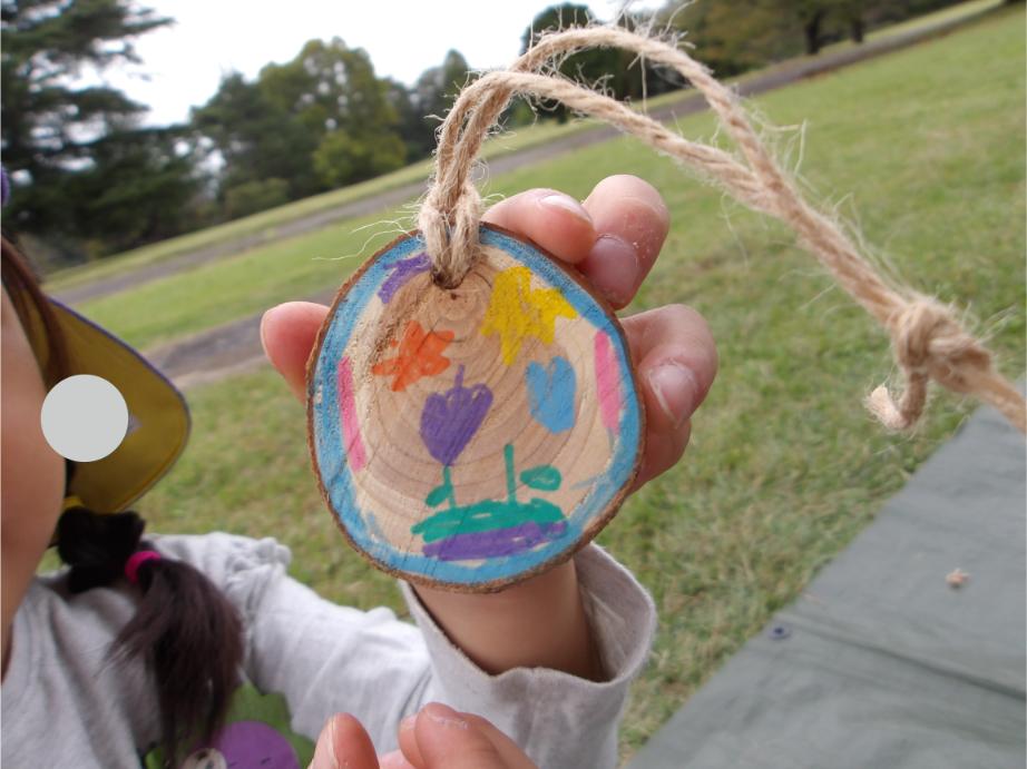 ケロちゃんから木のメダルをもらい、好きなように絵を描いたり
