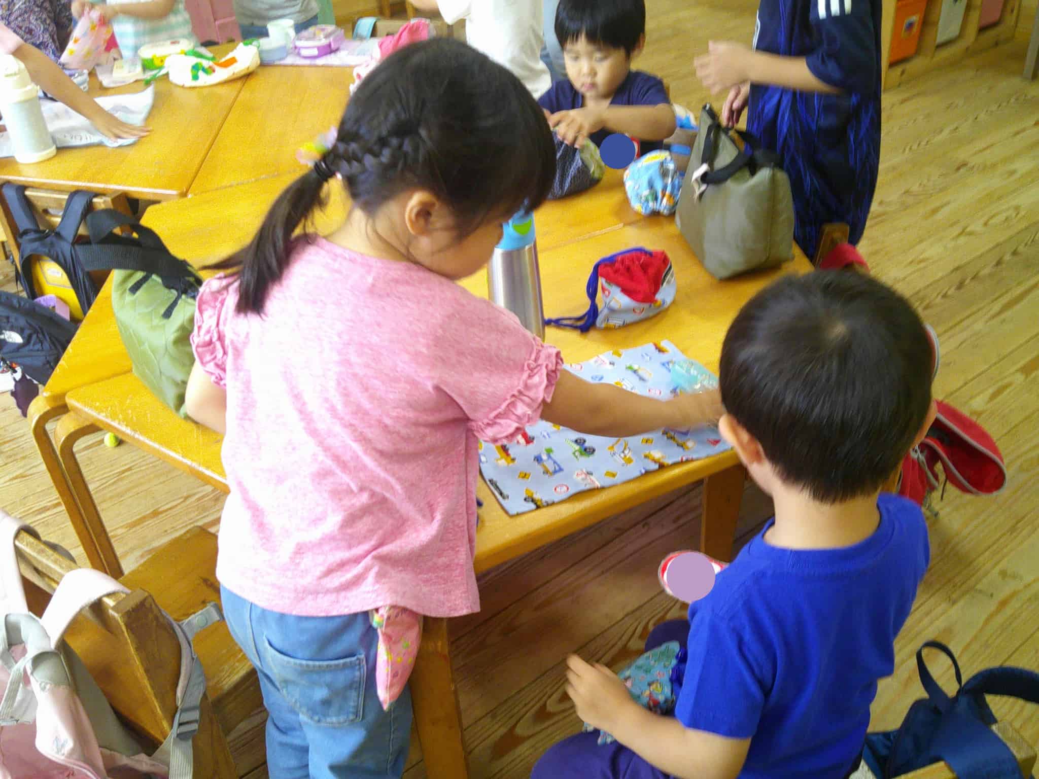最近こんなことをしています! 園の生活にもすっかり慣れた様子の子どもたちです。 全てが新しい出会いで、刺激を受け、やってみたい!と、いろいろなことを経験しながら過ごしています。 初めてのお弁当は年長さんと一緒に!準備や片付け、どうやるのかな? 見て、真似て、教えてもらって自分たちで頑張りました。 10月6日は十五夜。年長さんが作ってくれたお月見団子を頂きました。 美味しい!!ほっぺたが落ちちゃいそう! 夜空のお月様とも出会えますように!